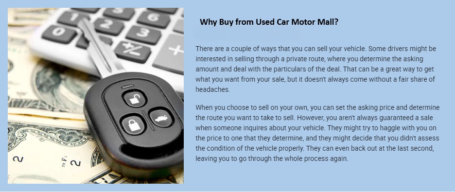 If you're looking to avoid these struggles, the team at Used Car Motor Mall is happy to help! We'll provide an assessment of the vehicle and determine a value based on its background, condition, and more! Vehicles are currently worth more now than ever before, so selling now will get you more back to spend how you see fit. We're happy to help you find an option from our dealership, but you can also pocket the check and use it for whatever else might suit you!